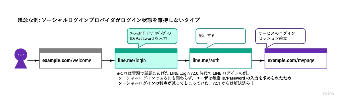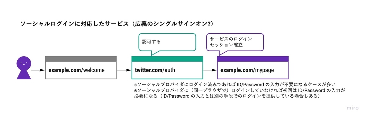 ソーシャルログインを用いると、たいていの場合、ユーザが ID と Password を入力するのは認可プロバイダ(ソーシャルログインプロバイダ)のログインセッションを確立する初回アクセス時のみになる。